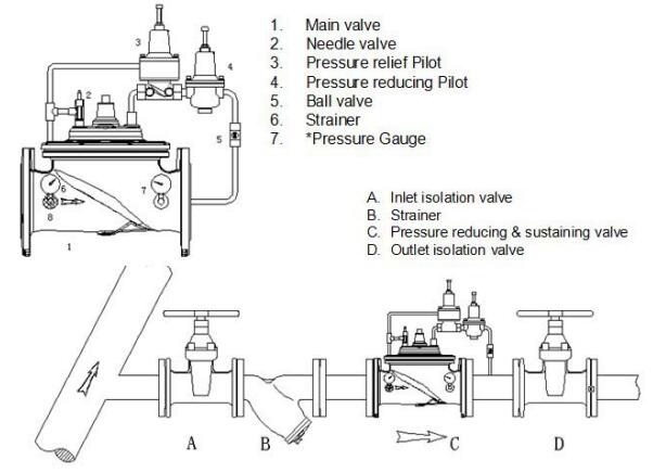Maintain the pressure of the client pipe; when the pipe pressure exceeds the set value, the valve opens automatically, releasing the excess pressure to the downstream; when the pipe pressure is below the set value, the valve closes;